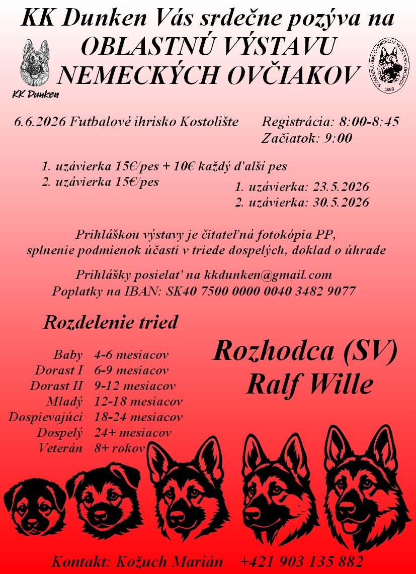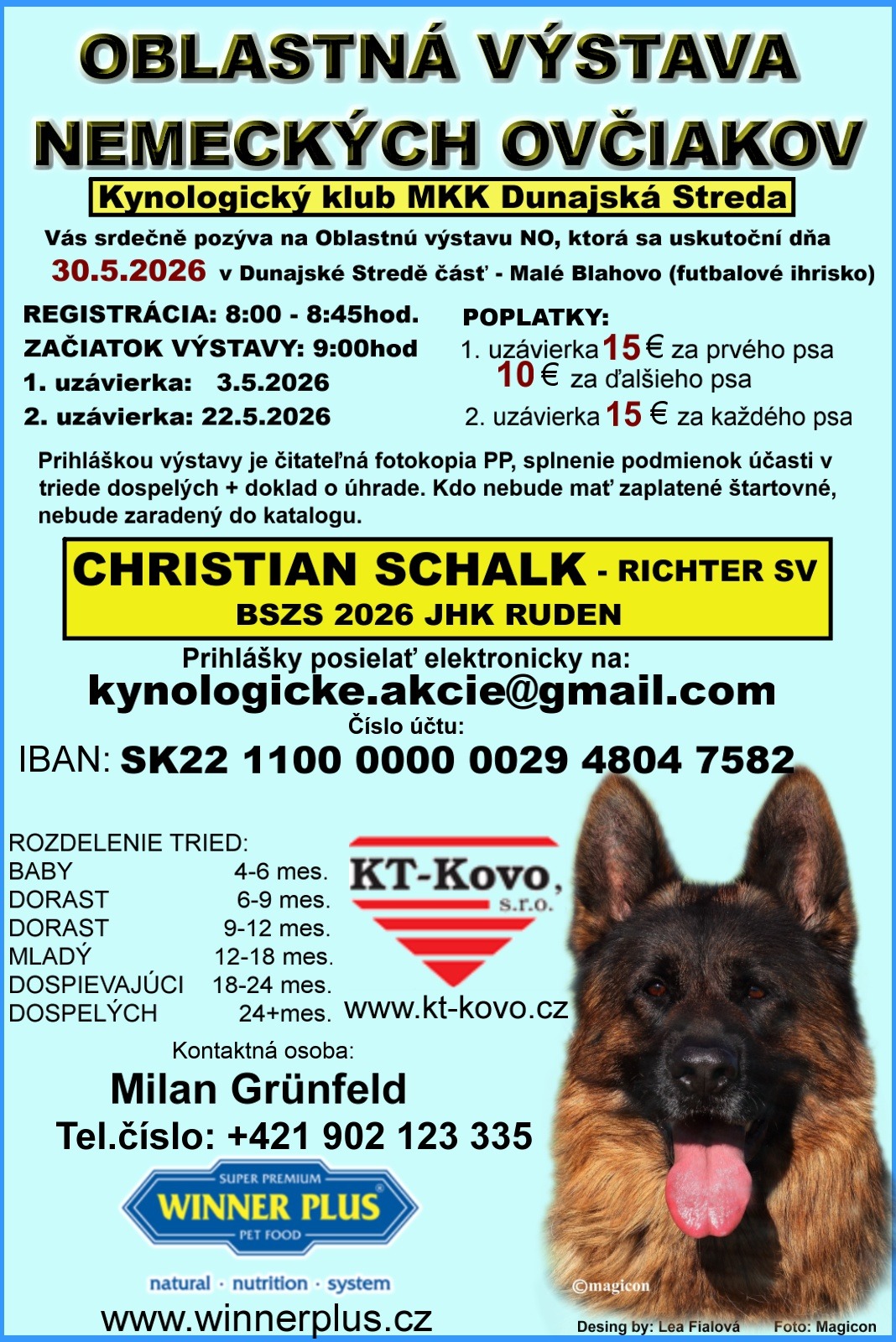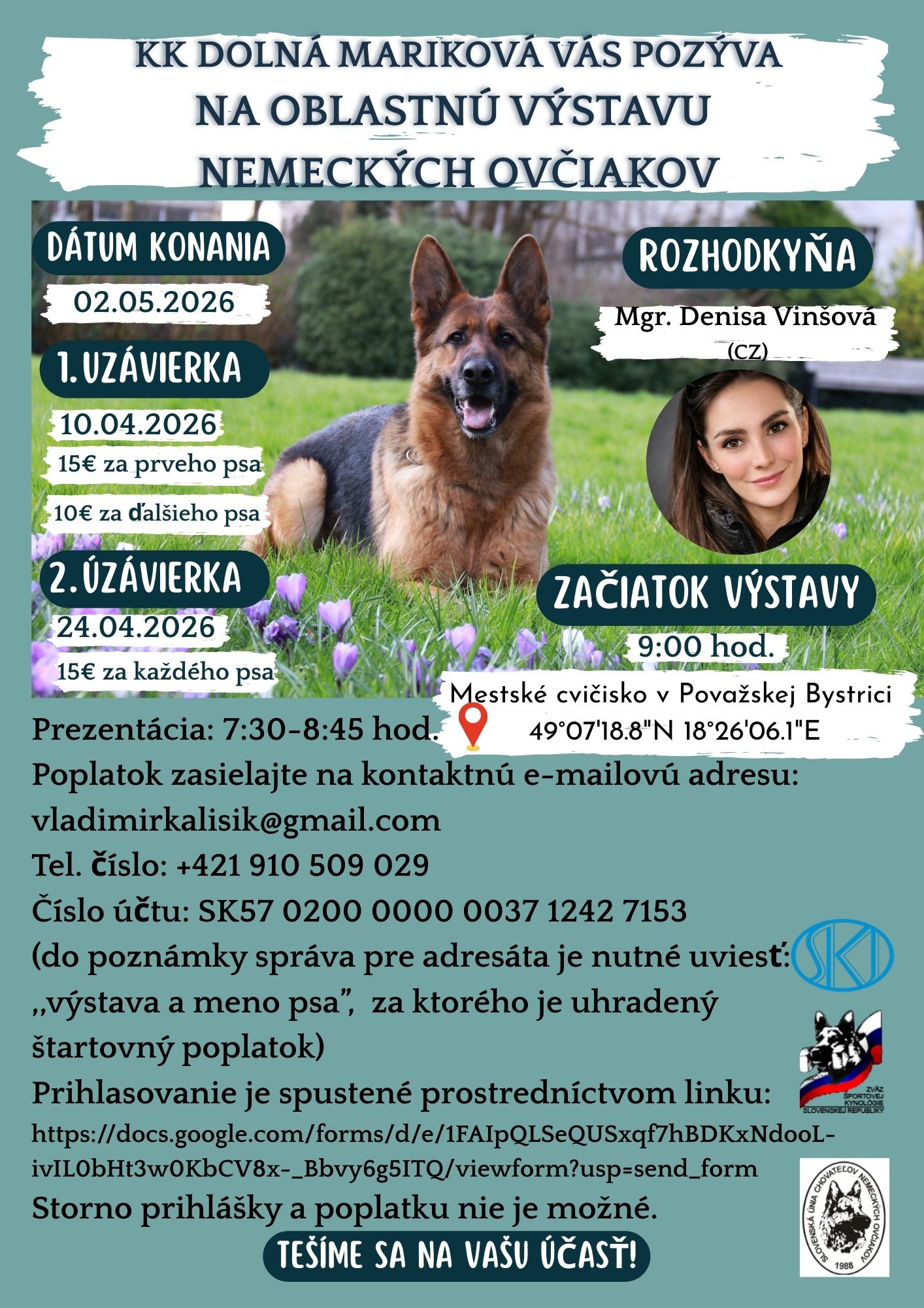 Kynologický Klub Dolná MarikováVás pozýva oblastnú výstavu NO Dňa: 02.05.2026Prezentácia: 7.30-8.45 hod.Začiatok výstavy: 9.00 hod.Miesto konania: Mestské cvičisko v Považskej BystriciGPS: 49°07’22.9″N 18°26’08.4″ERozhodkyňa: Mgr. Denisa Vinšová (CZ)1.Uzávierka: 10.04.2026, 15€ za čítajte viac